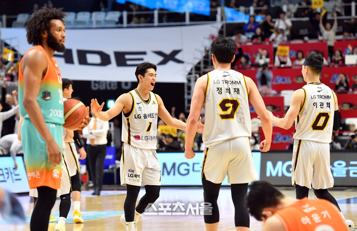LG 양준석이 28일 수원KT아레나에서 열린 2023-2024 프로농구 수원KT와 창원LG의 경기에서 경기 막판 KT의 추격을 뿌리치며 승리가 거의 확실시 되자 환호하고 있다. 2024.01.28. 수원 | 강영조 기자 kanjo@sportsseoul.com