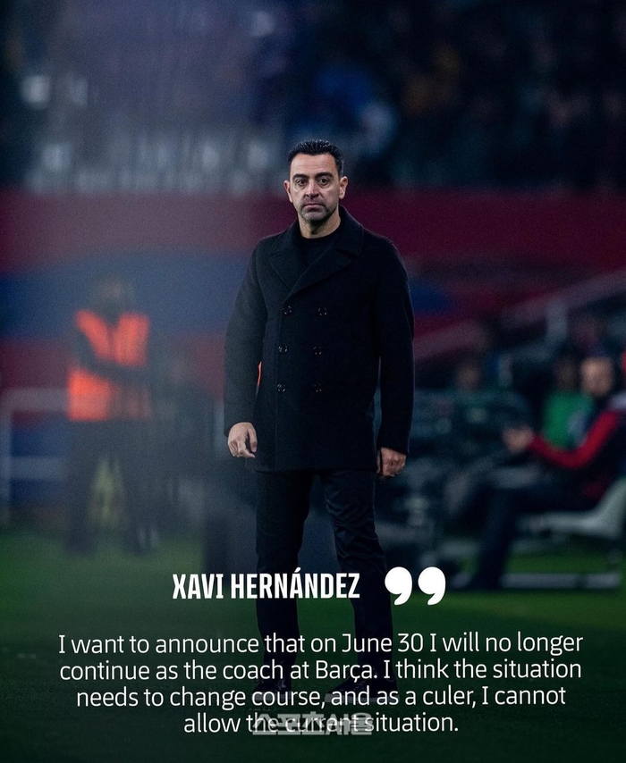 앞서 사비 감독은 지난 27일(현지시간) 비야 레알과의 2023~2024 스페인 라리가 홈경기에서 3-5로 진 뒤 “현 상황을 받아들일 수 없다”며 이번 시즌을 끝으로 물러날 것이라고 밝힌 바 있다.