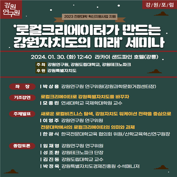 [스포츠서울ㅣ춘천=김기원기자] 강원연구원(원장 현진권)은 강원도립대학교(총장 김광래), 강원테크노파크(원장 허장현)와 2024년 1월 30일(화) 13시 강릉 라카이샌드 호텔에서 심포지움을 개최한다.