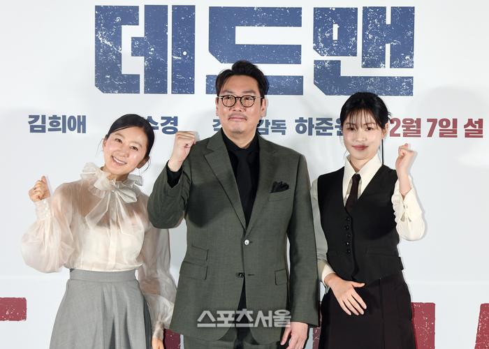 배우 김희애(왼쪽)와 조진웅(가운데), 이수경이 29일 서울 강남구 코엑스 메가박스에서 진행된 영화 ‘데드맨’ 시사회 및 기자간담회에서 취재진을 향해 포즈를 취하고 있다. 영화 ‘데드맨’은 이름값으로 돈을 버는 일명 바지사장계의 에이스가 1천억 횡령 누명을 쓰고 ‘죽은 사람’으로 살아가게 된 후 이와 얽힌 사람들과 빼앗긴 인생을 되찾기 위해 추적에 나서는 이야기를 담았으며 배우 조진웅, 김희애, 이수경 등이 출연하며 하준원 감독이 각본과 연출을 맡았다. 2024. 1. 29. 박진업 기자 upandup@sportsseoul.com