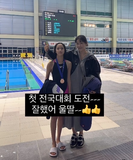 영상 속 수영대회에 참가한 현영의 딸은 물살을 가르며 수영을 하고 있다. 현영은 메달을 목에 건 딸 옆에서 환한 미소를 짓고 있다.