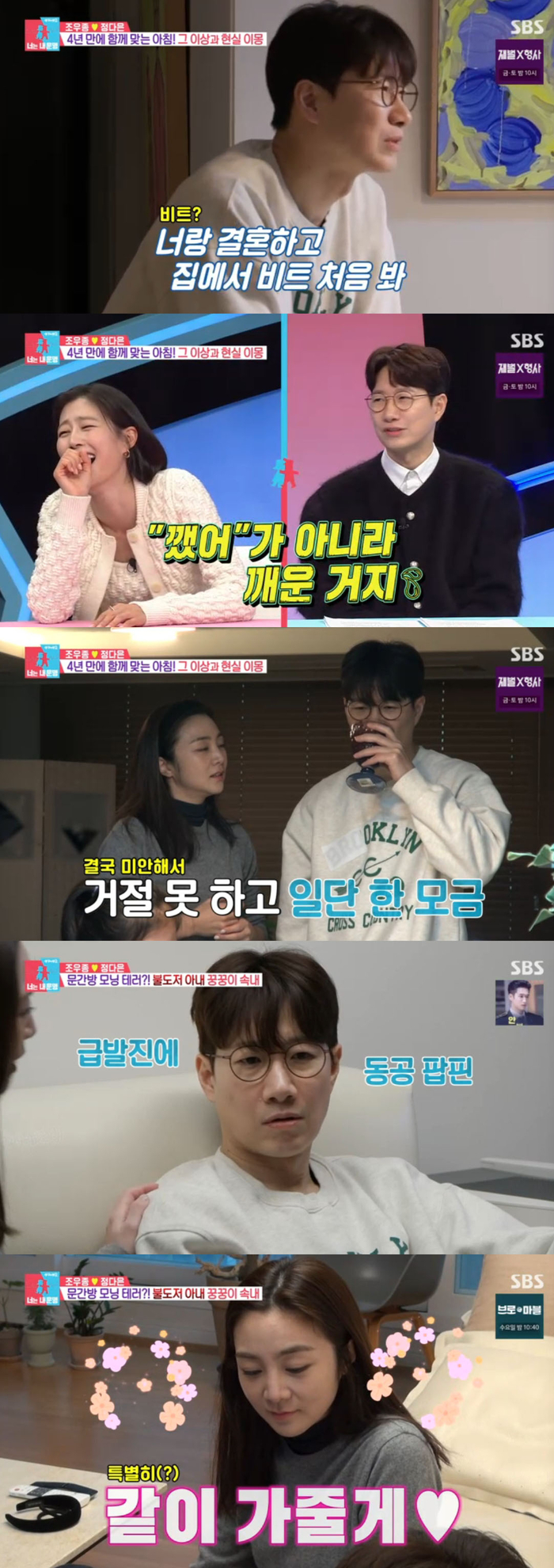 하지만 내조를 자처한 정다은이 해독주스를 갈면서 ‘모닝 평화’도 함께 갈렸다. “혹시 아파트 공사하냐?”며 부스스한 얼굴로 일어난 조우종은 “어디서 흙냄새가 나?”라는 반응이었다.