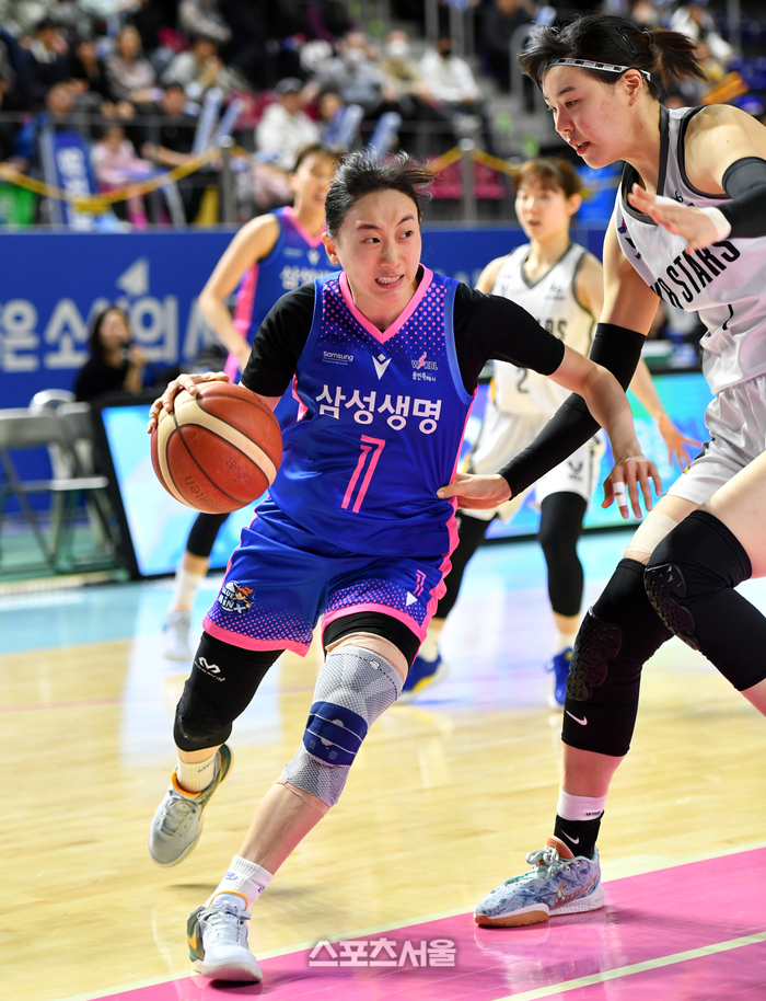 삼성 이주연이 31일 용인실내체육관에서 열린 2023-2024 WKBL 정규리그 삼성생명과 KB스타즈 경기에서 박지수를 따돌리며 돌파를 시도하고 있다. 2024.01.31.