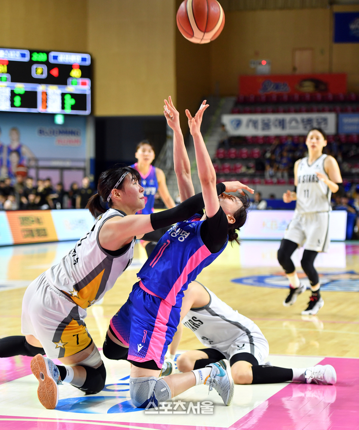 삼성 이주연이 31일 용인실내체육관에서 열린 2023-2024 WKBL 정규리그 삼성생명과 KB스타즈 경기에서 코트에 쓰러져 박지수의 마크를 받으며 슈팅을 시도하고 있다. 2024.01.31. 용인 | 강영조 기자 kanjo@sportsseoul.com