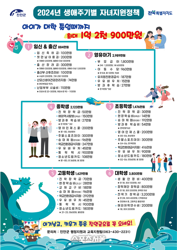 [스포츠서울 l 진안=고봉석 기자] 전북 진안군이 아이 낳고 키우기 좋은 가족친화형 도시를 표방하며 2024년 기준 생애주기별 자녀지원정책을 한눈에 알아보기 편한 포스터를 제작하고, 배부에 나섰다고 31일 밝혔다.