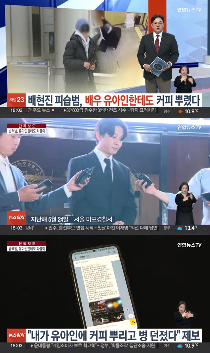 연합뉴스TV는 31일 “국민의힘 배현진 의원을 공격했던 A군이 경복궁 낙서 모방범에게 지갑을 던진 학생이라는 사실, 저희가 단독으로 전해드린 바 있다. 이 학생이 마약 투약 혐의를 받는 유아인에게도 커피를 뿌리고 병을 던졌던 것으로 확인됐다”라고 보도했다.