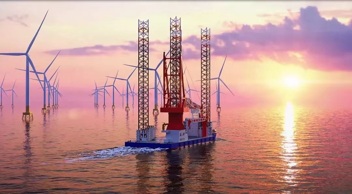 길이 133m, 폭50m, 높이 11m의 강항핑 5호는 바다 위에서 15MW 급 해상풍력 터빈, 블레이드, 타워를 인양,운반,설치까지 한번에 가능한 3만 톤급 자항식 선박이다. 진수는 올해 12월 예정이다.