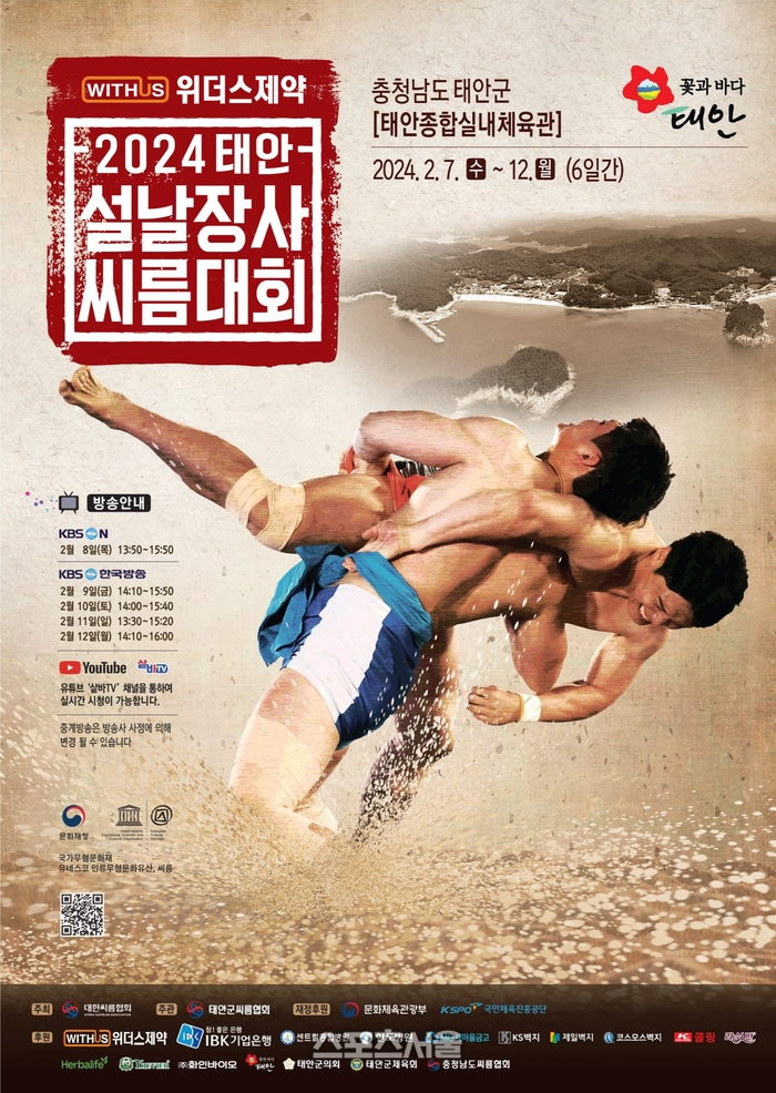 2024 시즌 씨름대회 개막 알리는 ‘위더스제약 2024 태안설날장사씨름대회’가 7~12일 충남 태안군 태안종합실내체육관에서 열린다.