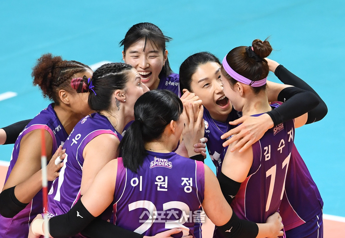 흥국생명 김연경(왼쪽 둘째)이 2일 서울 장충체육관에서 열린 2023-2024 V리그 여자부 GS칼텍스와 경기에서 김수지의 블로킹 득점에 기뻐하고 있다. 2024. 2. 2. 장충 | 박진업 기자 upandup@sportsseoul.com