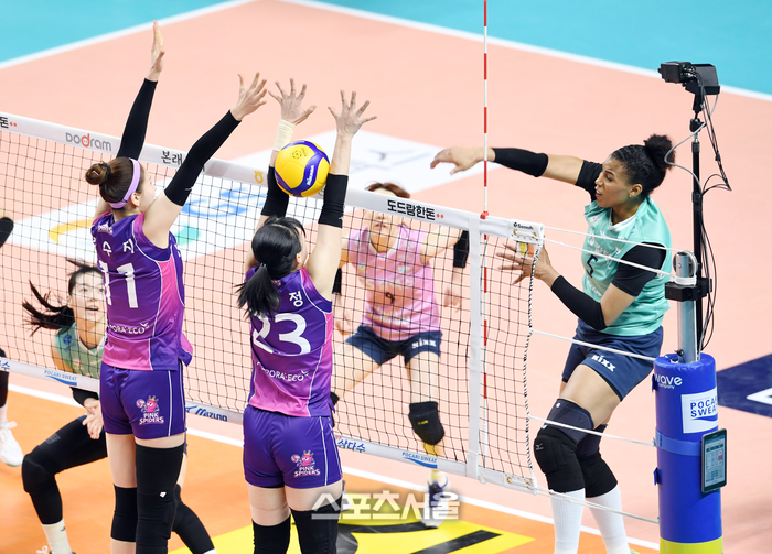 GS칼텍스 실바(오른쪽)가 2일 서울 장충체육관에서 열린 2023-2024 V리그 여자부 흥국생명과 경기에서 스파이크 공격을 하고 있다. 2024. 2. 2. 장충 | 박진업 기자 upandup@sportsseoul.com