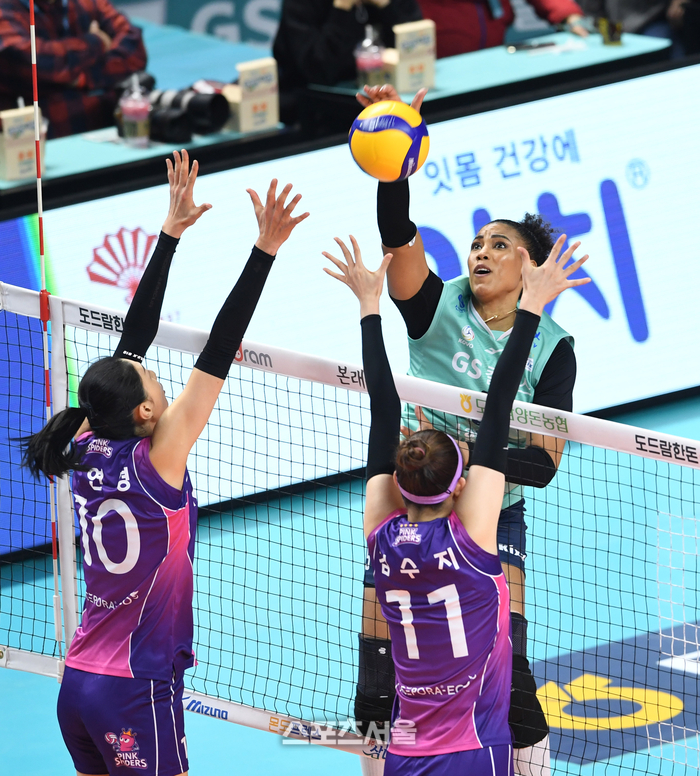 GS칼텍스 실바(오른쪽 위)가 2일 서울 장충체육관에서 열린 2023-2024 V리그 여자부 흥국생명과 경기에서 스파이크 공격을 하고 있다. 2024. 2. 2. 장충 | 박진업 기자 upandup@sportsseoul.com