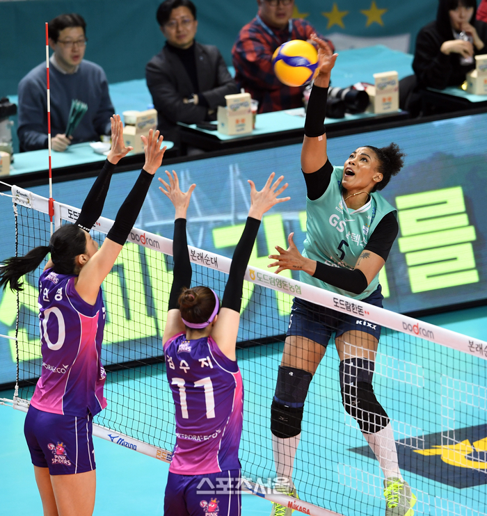 GS칼텍스 실바(오른쪽)가 2일 서울 장충체육관에서 열린 2023-2024 V리그 여자부 흥국생명과 경기에서 스파이크 공격을 하고 있다. 2024. 2. 2. 장충 | 박진업 기자 upandup@sportsseoul.com