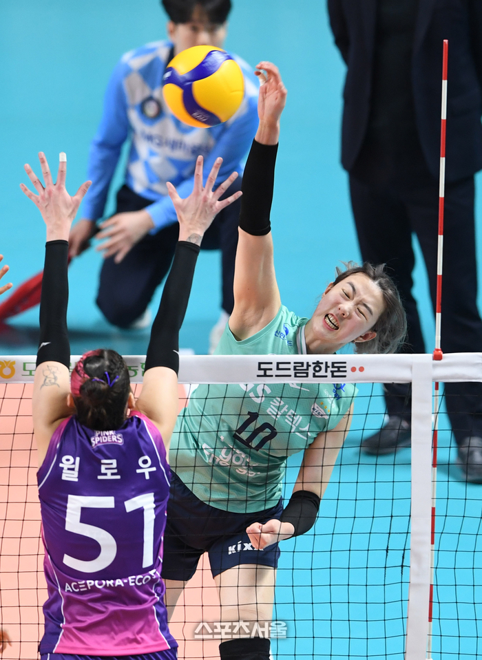 GS칼텍스 강소휘(오른쪽)가 2일 서울 장충체육관에서 열린 2023-2024 V리그 여자부 흥국생명과 경기에서 스파이크 공격을 하고 있다. 2024. 2. 2. 장충 | 박진업 기자 upandup@sportsseoul.com