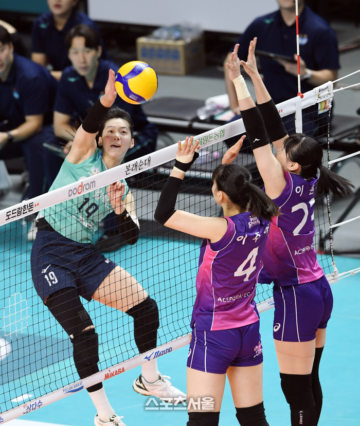 GS칼텍스 유소연(왼쪽)이 2일 서울 장충체육관에서 열린 2023-2024 V리그 여자부 흥국생명과 경기에서 스파이크 공격을 하고 있다. 2024. 2. 2. 장충 | 박진업 기자 upandup@sportsseoul.com