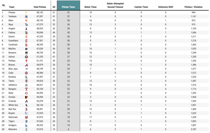 ML는 지난해 750회가 넘는 투수 피치 클락 위반 사례가 나왔다. KBO리그도 위반 사례가 없을 수는 없다. 흥미로운 것은 구단마다 차이가 컸다는 점이다. 피츠버그가 41회였던 반면 시애틀은 6회에 불과했다. 투수 피치 클락 위반이 가장 많은 구단과 가장 적은 구단의 차이가 매우 컸다.