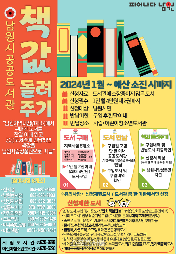 ‘책값 돌려주기 사업’은 시민들이 남원 지역서점에서 책을 구입해 읽고, 한 달 이내에 공공도서관(시립·어린이청소년)으로 구입한 책과 도서 구입을 증빙할 수 있는 영수증을 가져오면 월 2권 최대 4만원까지 남원사랑상품권으로 전액 지원하는 사업이다.