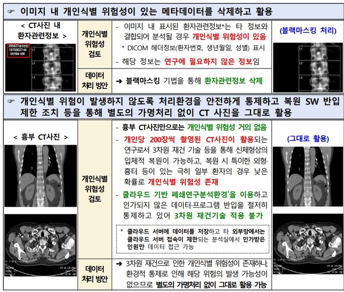 예를 들어, 눈·코·입을 알아볼 수 없는 거리·각도에서 찍힌 CCTV 영상·사진에서 머리 스타일·흉터·문신 등 특이한 신체적 특징 때문에 식별위험이 있을 수 있다. 흉부 CT 촬영 사진은 자체 식별위험이 크지 않지만, 3차원 재건 기술 악용과 특이한 흉터 등은 위험 요소가 될 수 있다.