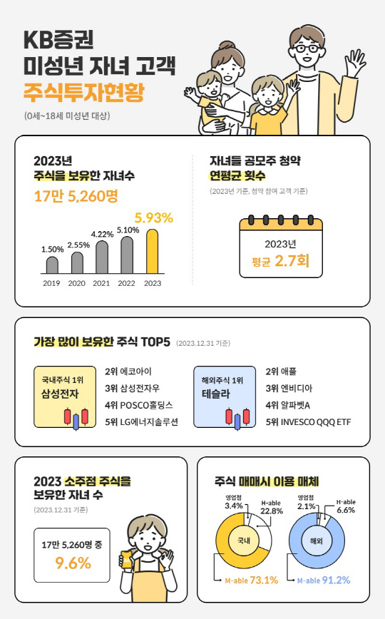 KB증권이 지난해 자사 미성년 고객의 투자 동향을 분석한 결과 전체 고객 대비 미성년 고객의 비율은 지난 2019년 1.50%에서 지난해 5.93%로 4.43%포인트(p) 증가했다.