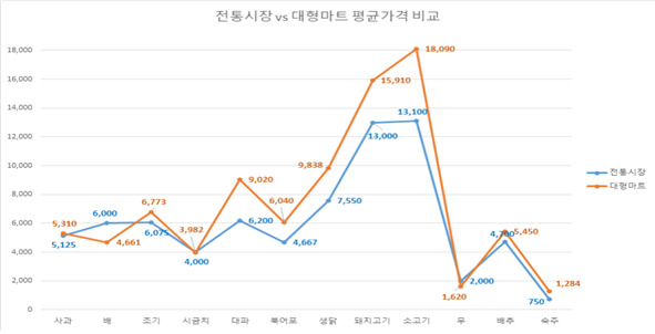 특히 대파, 북어포, 생닭, 돼지고기, 소고기, 숙주는 평균 20% 이상 전통시장이 쌌다.