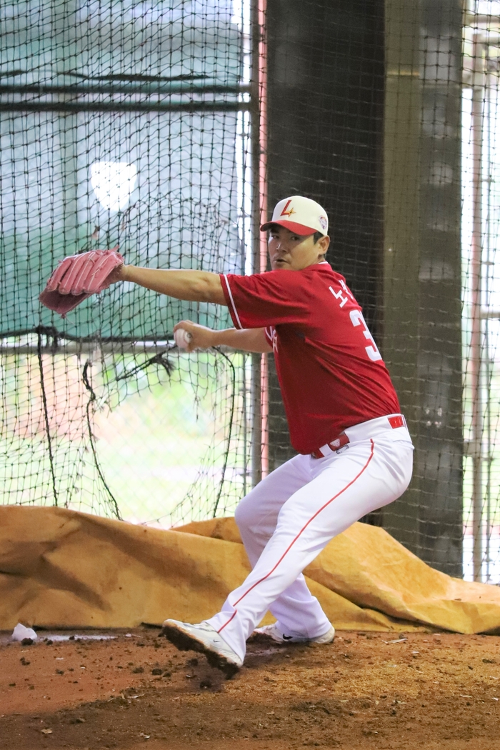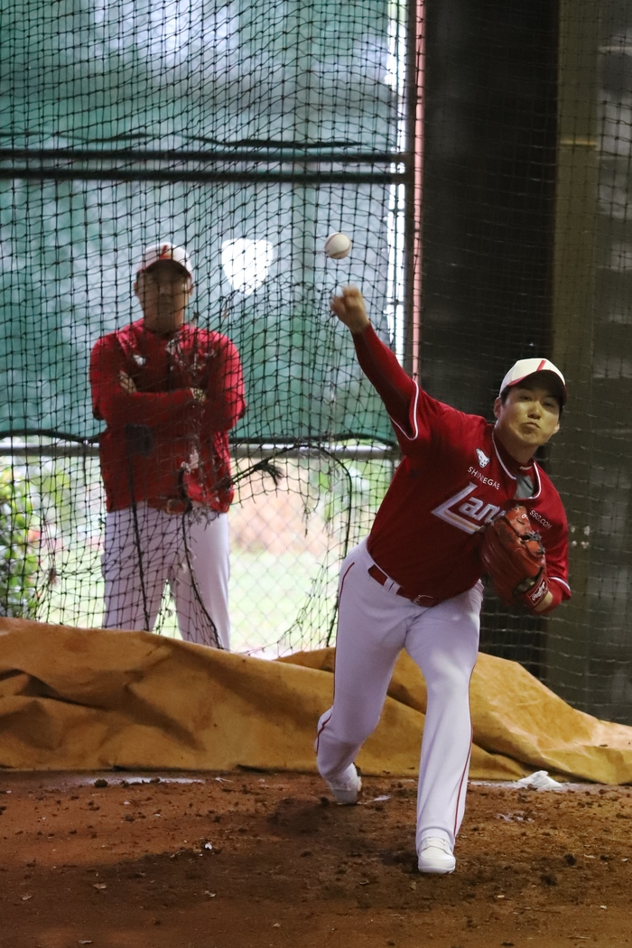 베테랑 노경은은 이날 처음으로 던졌다. 30개를 뿌렸다. 속구와 커브를 던지며 점검했다. 투구 후 “마음에 들었다. 첫 피칭인데 좋았다. 준비 열심히 하고 왔다”며 웃었다.