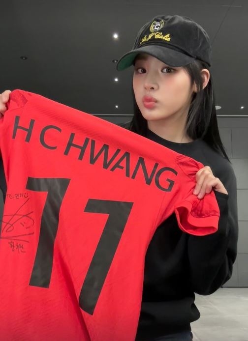 민지는 대한민국 축구 국가대표팀 황희찬의 등번호 11번이 적힌 유니폼을 들고 인증샷을 남겼다. 또 다른 사진에는 유니폼에 황희찬의 사인이 담겨 있어 눈길을 끌었다.