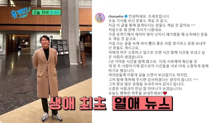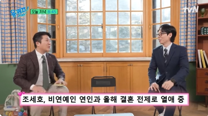 열애 소식이 공개된 뒤 첫 ‘유퀴즈’ 녹화에 참여한 조세호, 유재석은 조세호가 등장하자 “아이고 예랑씨”라고 박수를 치며 축하했다.