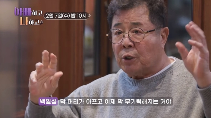 영상 속 백일섭의 딸은 “아빠 보청기는 언제 하셨어요?”라고 물었다. 백일섭은 “오래됐다 나는. 한 7~8년을 상대방 대사가 안 들려서 (상대 배우) 눈, 입 모양새를 보는 거다. 끝날 때 되면 대사를 받아야 하니까. 얼마나 신경질 났겠어? 그런데도 보청기 낄 생각을 안 했다. 그러고도 한 1년 지나서 도저히 안 되겠더라. 막 머리가 아프고 이제 막 무기력해지는 거다. 그래서 보청기를 맞췄다”고 설명했다.