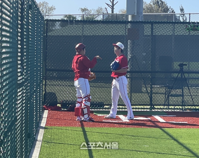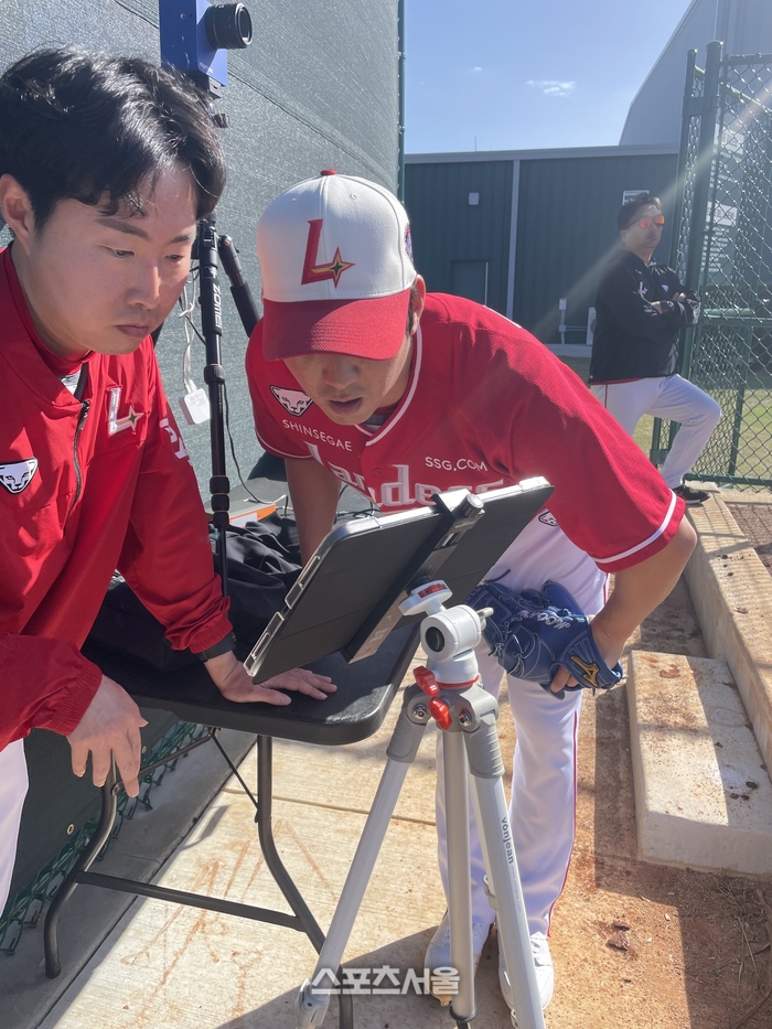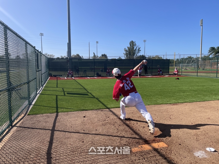 문승원은 이날 캠프 두 번째 불펜피칭을 진행했다. 45개를 뿌렸다. 주무기 슬라이더를 집중적으로 점검하는 모습. 지켜보던 이숭용 감독과 송신영 수석코치, 배영수 투수코치 모두 “나이스”를 외쳤다.