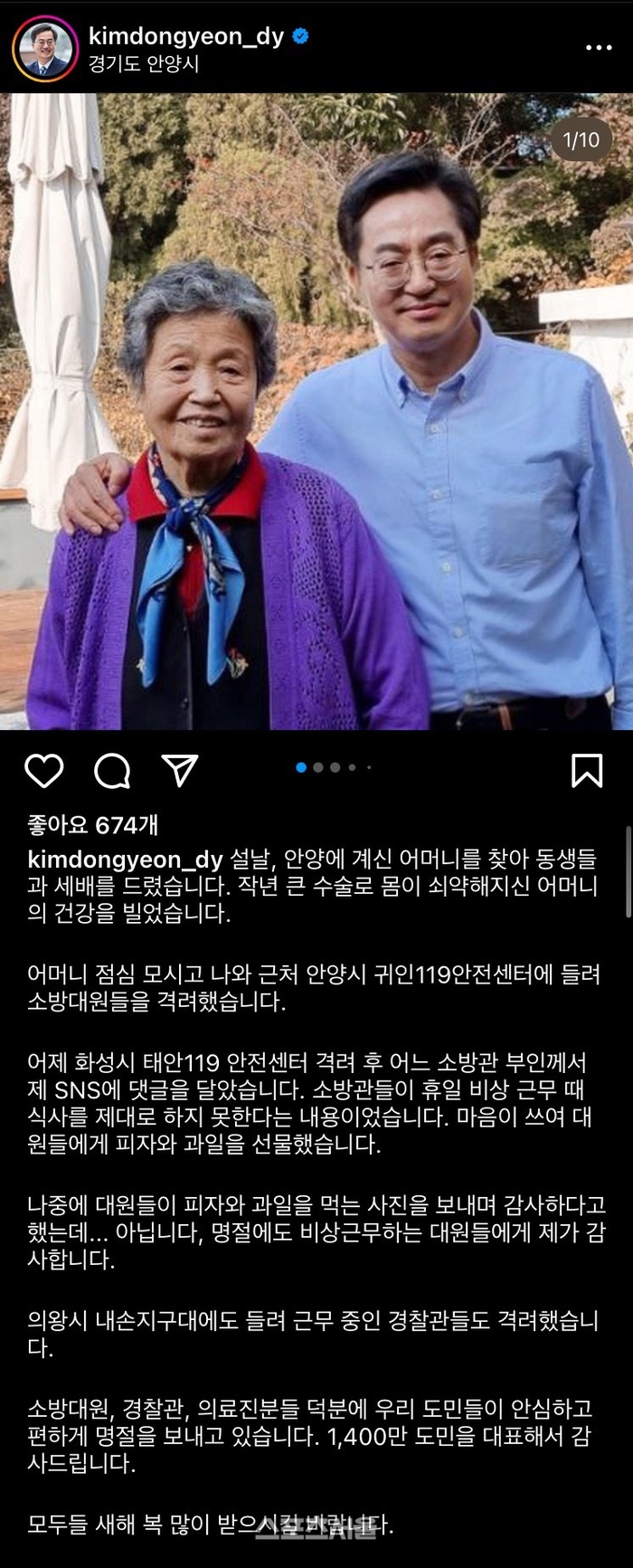 〔스포츠서울│수원=좌승훈기자〕김동연 경기도지사는 10일 자신의 SNS를 통해 “설날, 안양에 계신 어머니를 찾아 동생들과 세배를 드렸다. 작년 큰 수술로 몸이 쇠약해지신 어머니의 건강을 빌었다”면서 “어머지를 모시고 나와 점심을 같이하고, 근처 안양시 귀인119안전센터에 들러 소방대원들을 격려했다”고 전했다.