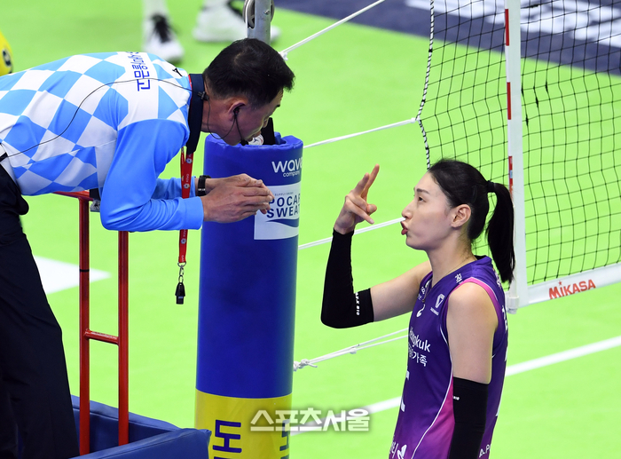 흥국생명 김연경(오른쪽)이 12일 수원체육관에서 열린 2023-2024 V리그 여자부 현대건설과 경기에서 남영수 주심과 이야기를 나누고 있다. 2024. 2. 12. 수원 | 박진업 기자 upandup@sportsseoul.com