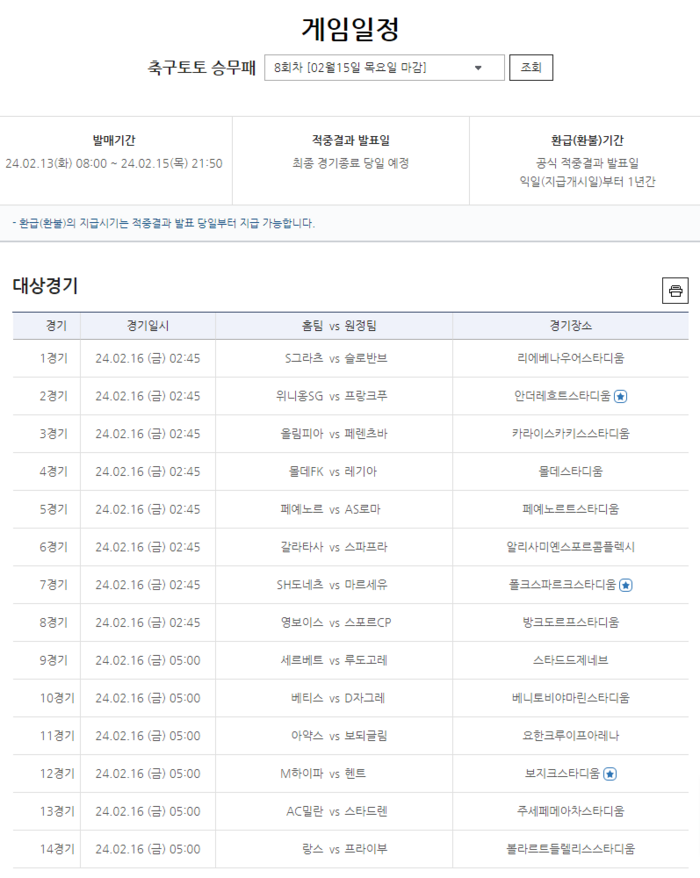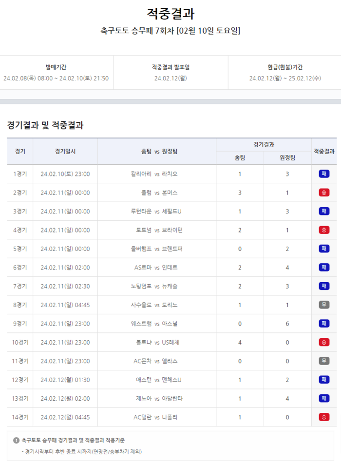 [스포츠서울 | 황혜정 기자] EPL 및 세리에A 14경기를 대상으로 실시한 축구토토 승무패 7회차 게임에서 총 20건의 1등 적중이 발생했다.