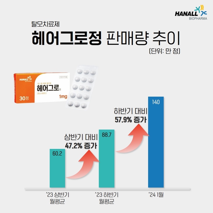 [스포츠서울 | 김효원 기자] 한올바이오파마(공동대표 박수진, 정승원)의 탈모치료제 ‘헤어그로정’(성분명 피나스테리드)이 지난 1월 한 달간 140만 정 판매됐다. 지난해 하반기 월평균 판매량 대비 57.9% 증가한 수치라고 한올바이오파마 측은 밝혔다.
