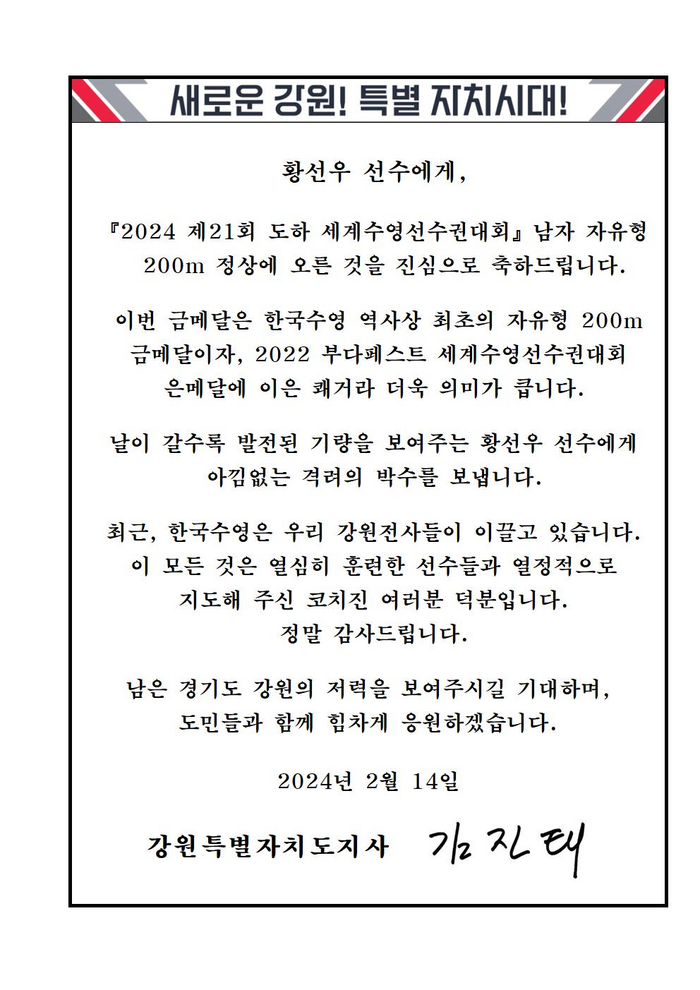 [스포츠서울ㅣ춘천=김기원 기자] 김진태 강원특별자치도지사가 14일 2024 제21회 도하 세계선수권대회에서 한국 수영 역사상 최초의 자유형 200m 금메달을 획득한 강원도청 소속 황선우 선수에게 축전을 보냈다.