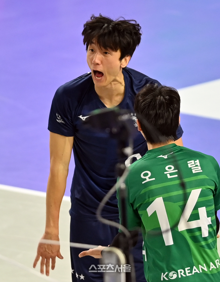대한항공 곽승석이 14일 계양실내체육관에서 열린 2023-2024 V리그 대한항공과 OK금융그룹의 경기에서 서브에이스를 기록한후 환호하고 있다. .2024.02.14. 계양 | 강영조 기자 kanjo@sportsseoul.com