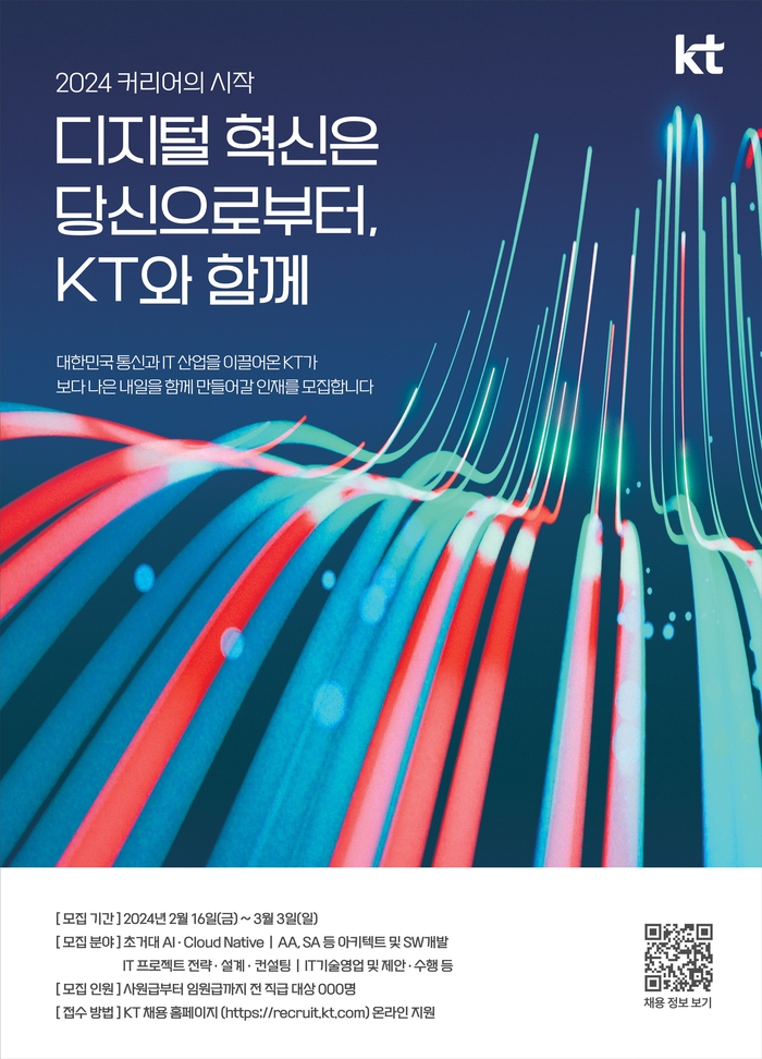 KT는 오는 이달 16일부터 다음 달 3일까지 KT 채용 홈페이지를 통해 실무 역량을 갖춘 사원급부터 탁월한 인사이트와 전문성을 쌓아온 임원급까지 전 직급 대상 채용을 진행한다고 15일 밝혔다.