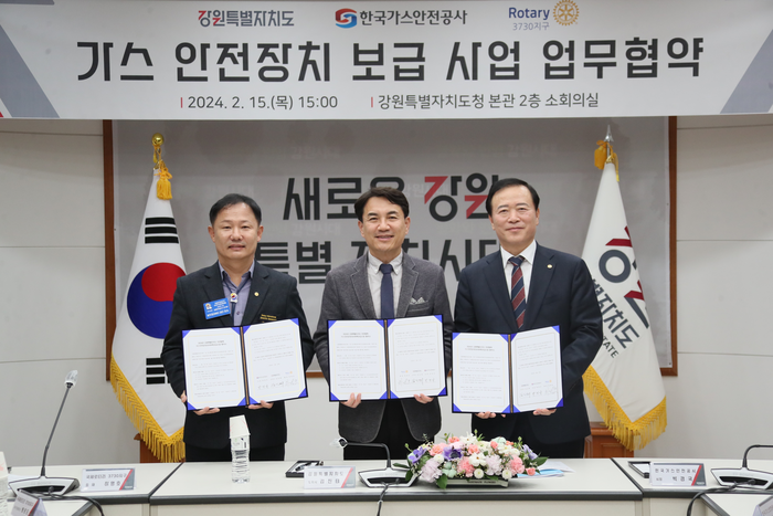 [스포츠서울ㅣ춘천=김기원기자] 김진태 강원특별자치도지사가 2월 15일(목) 오후 3시 도청 본관2층 소회의실에서 취약계층의 안전복지 실현과 가스사고 예방을 위해 가스 안전장치 타이머콕 보급지원 업무협약을 맺었다.