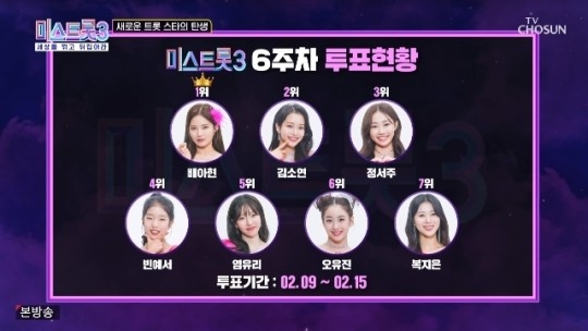 15일 방송된 TV조선 ‘미스트롯3’에서는 6주 차 온라인 투표 현황이 공개됐다. 이날 1위에는 지난 주 2위였던 배아현이 이름을 올렸다.