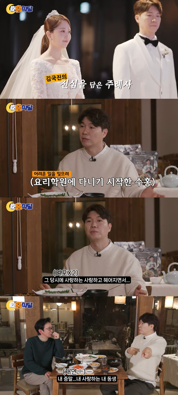 박수홍은 “그때 당시에 제가 어려운 일이 있어서 그걸 잊으려고”라더니 “와이프가 있는 데서 이런 말을 해도 되나. 당시에 사랑하는 사람이랑 헤어지면서 잠을 못 자서 요리학원을”이라고 설명했다.
