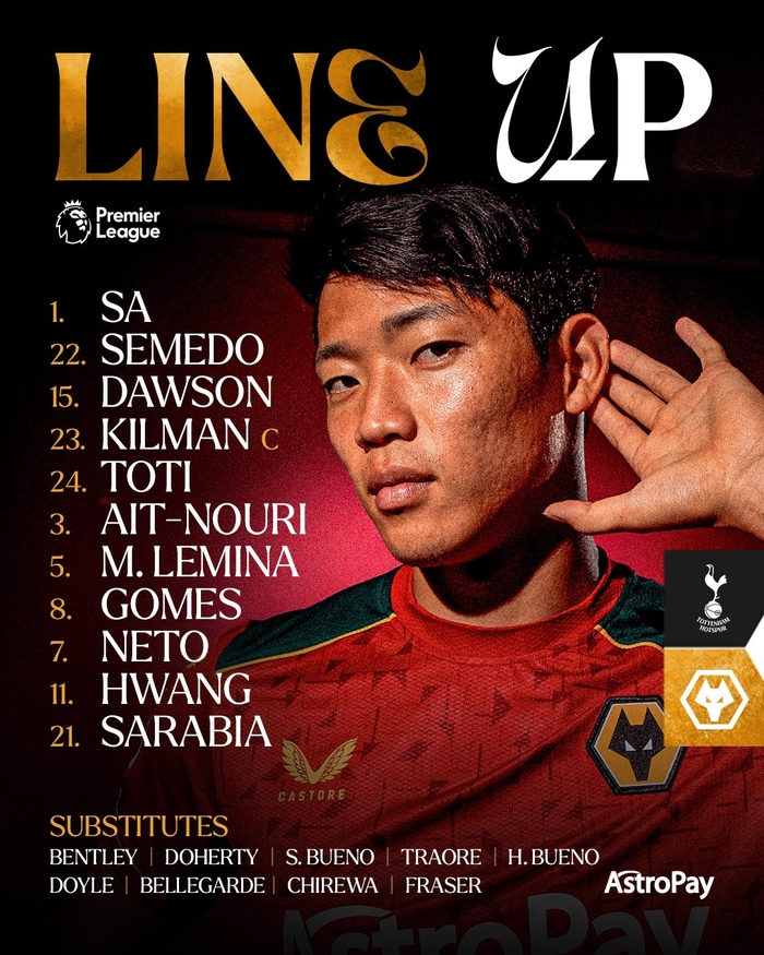 울버햄턴은 17일 영국 런던 토트넘 홋스퍼 스타디움에서 2023~2024시즌 잉글랜드 프리미어리그(EPL) 25라운드 토트넘과 맞대결에서 전반을 1-0으로 마쳤다.