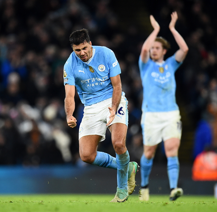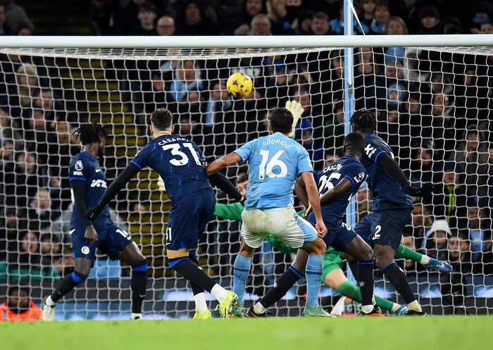 17일(현지시간) 맨체스터의 에티하드 스타디움에서 열린 2023~2024 잉글랜드 프리미어리그 경기. 맨시티는 첼시를 맞아 전반 42분 라힘 스털링한테 골을 내주는 등 고전했으나, 후반 38분 터진 로드리의 골로 1-1 무승부를 기록했다.