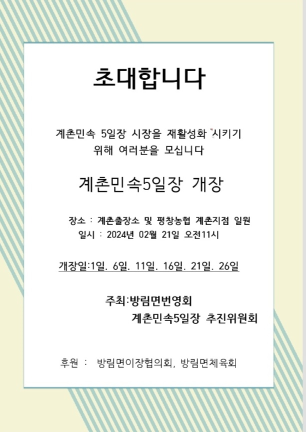 지역 주민들은 지역 경제를 살리고 주민들에게 옛 향수를 되살려 주기 위해‘계촌민속5일장추진위원회(회장 주국창)’를 꾸리고 5일장 살리기에 힘을 쏟은 끝에 방림면 번영회, 이장협의회, 체육회 및 지역 상인 등의 협조를 얻어 오는 21일 개장식을 가진다.
