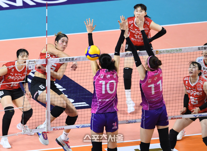페퍼저축은행 야스민(왼쪽)이 20일 인천 삼산월드체육관에서 열린 2023-2024 V리그 여자부 흥국생명과 경기에서 스파이크 공격을 하고 있다. 2024. 2. 20. 삼산 | 박진업 기자 upandup@sportsseoul.com