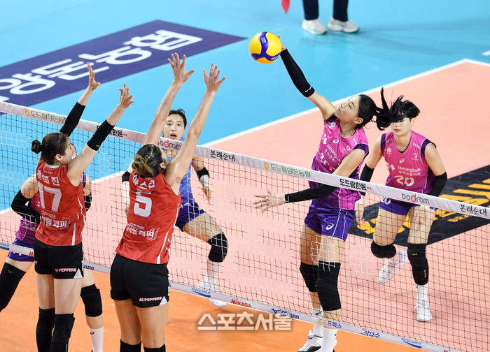 흥국생명 김연경(오른쪽)이 20일 인천 삼산월드체육관에서 열린 2023-2024 V리그 여자부 페퍼저축은행과 경기에서 스파이크 공격을 하고 있다. 2024. 2. 20. 삼산 | 박진업 기자 upandup@sportsseoul.com