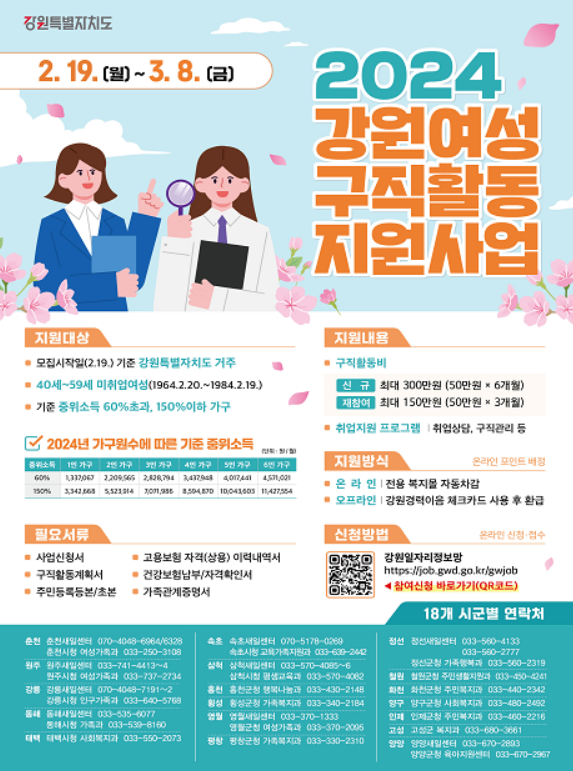 신청기간은 2월 19일부터 3월 8일까지이며, 사업 신청은 강원일자리정보망(https://job.gwd.go.kr/gwjob)을 통해 회원가입 후 사업신청서 및 구비서류를 첨부하고 신청하면 된다.