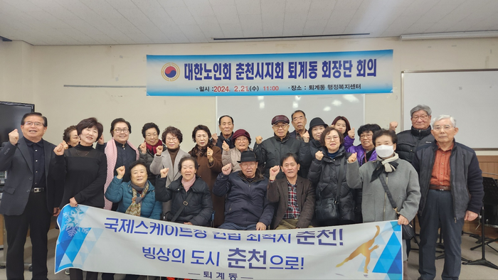 [스포츠서울ㅣ춘천=김기원기자] 대한노인회 춘천시지회 퇴계동 회장단(분회장 강덕원)은 지난 21일 퇴계동 행정복지센터에서 국제스케이트장 춘천 유치 결의문을 발표하고 릴레이 응원에 참여하고 적극 지지를 밝혔다.
