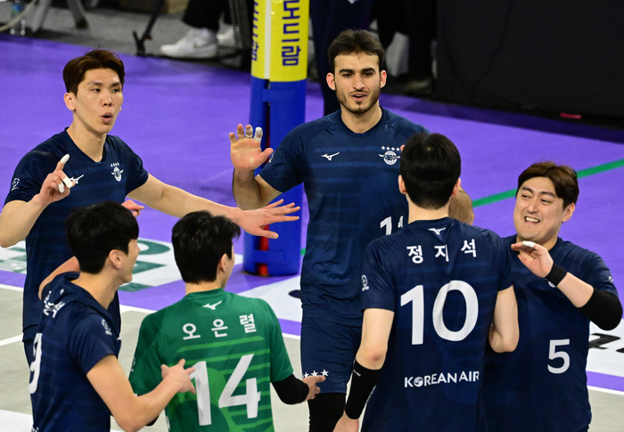 대한항공은 외국인 선수 무라드가 23득점에 공격 성공률 63.64%로 맹활약했다. 곽승석, 정지석, 김민재가 나란히 9득점씩 올려 힘을 보탰다. 블로킹에서 6-3, 서브 득점에서 7-2로 앞섰다.