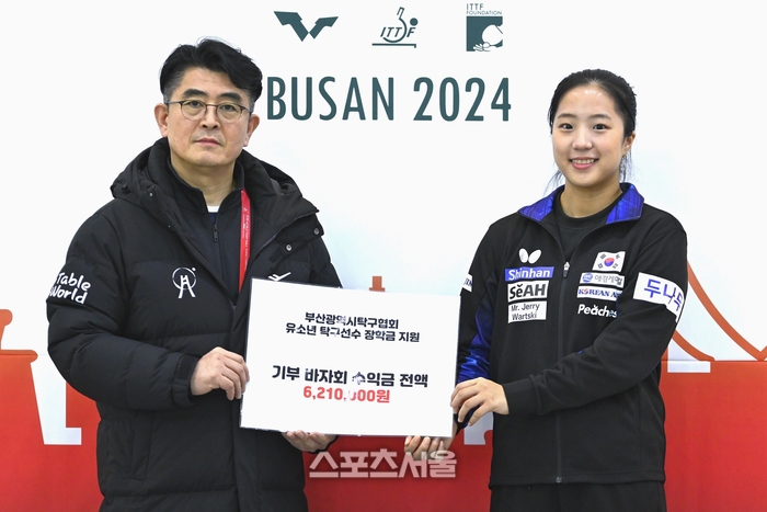 그의 소속사인 매니지먼트GNS는 25일 “2024 부산세계탁구선수권대회가 진행중인 벡스코에서 신유빈이 부산광역시탁구협회 박종우 회장에게 ‘부산시 유소년 탁구선수를 위해 장학금으로 써달라’며 바자회 수익금 전액을 전달했다”고 밝혔다.