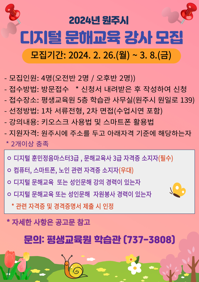 자세한 사항은 공고문을 참고하거나 원주시 평생교육원 학습관(☎ 033-737-3808)에 문의하면 된다.