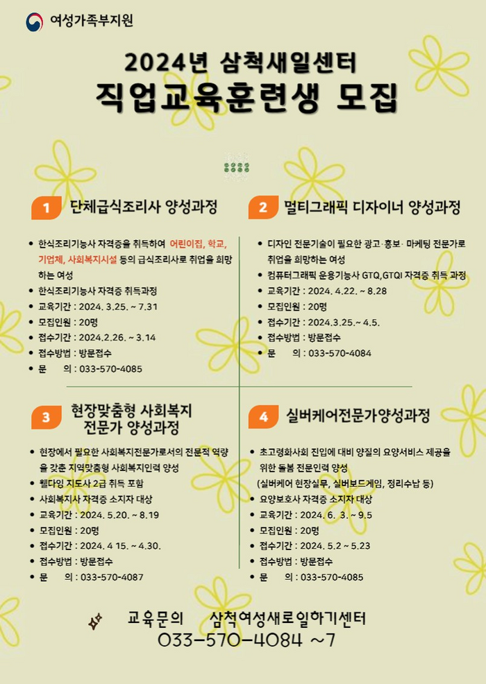 기타 자세한 사항은 삼척여성새로일하기센터(평생학습관 1층)에 직접 방문 또는 전화(033-570-4084(~4087)로 문의하면 된다.
