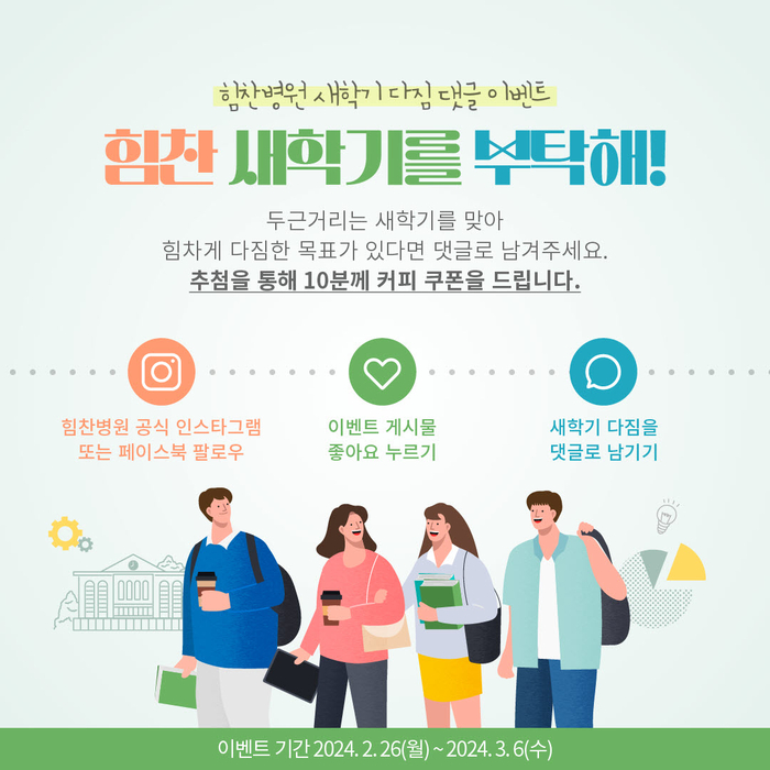 참여 방법은 힘찬병원 공식 인스타그램이나 페이스북을 팔로우 또는 친구 추가한 후 이벤트 게시물에 ‘좋아요’를 누르고 새학기 다짐을 댓글로 남기면 자동 응모된다.